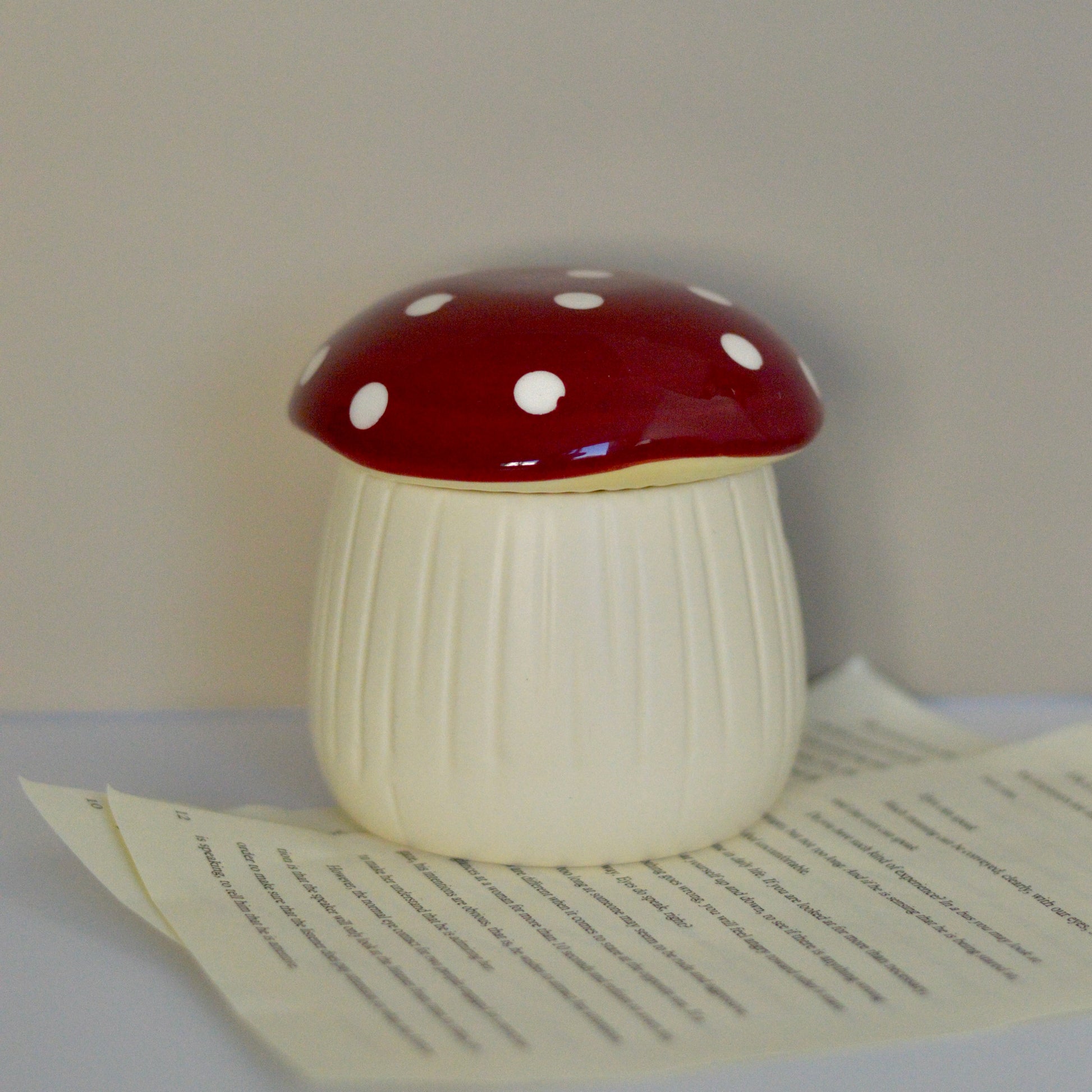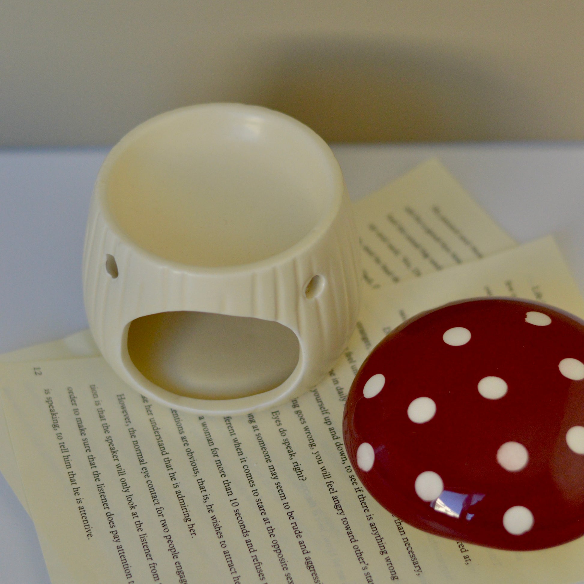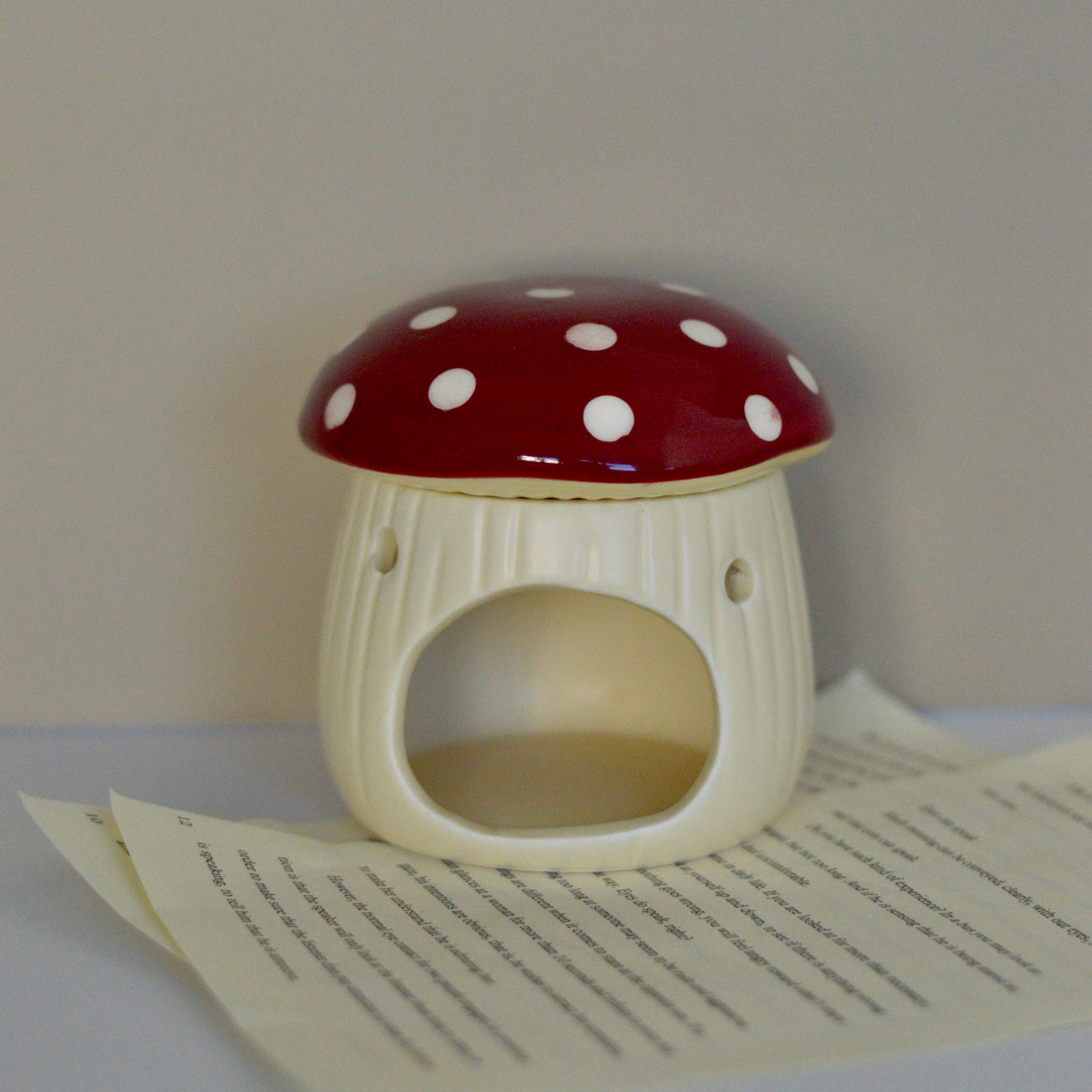 Fabricado con cerámica de alta calidad, este quemador presenta una cúpula superior que simula el sombrero de una seta, con detalles pintados a mano que le dan un toque único y artesanal. Su cavidad interior está diseñada para colocar una vela de té, que al encenderse derrite suavemente los wax melts ubicados en la parte superior, liberando su aroma favorito de manera gradual y duradera.